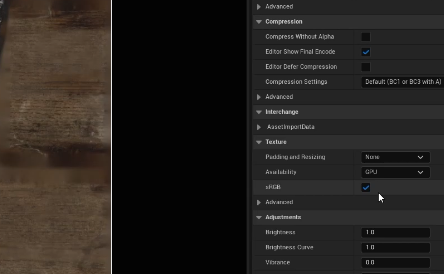 메탈릭과 러프니스 맵은 물리적 특성 정보이기 때문에 sRGB 옵션 체크 꺼야한다. 비활성화 해줘야한다.
